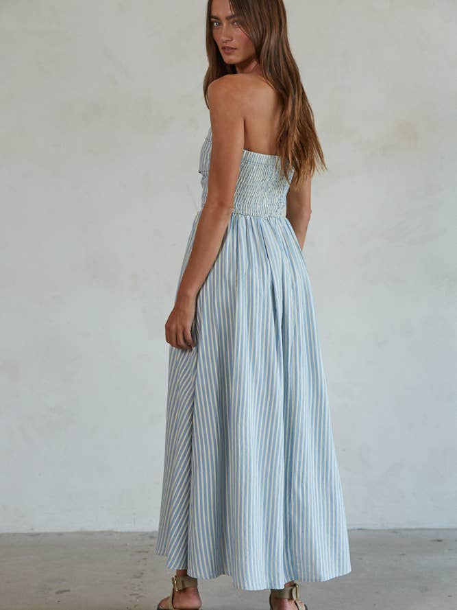 This elegant strapless dress exudes timeless style with its classic striped pattern. The smocked bodice adds a touch of femininity and accentuates the waistline, while the flowing, midi-length skirt creates a sense of movement and grace. The lightweight, woven fabric blend of 86% Rayon, 11% Polyester, and 3% Nylon drapes beautifully, ensuring comfort and ease of wear. This versatile dress is perfect for a variety of occasions, from a casual day out to a special evening event.