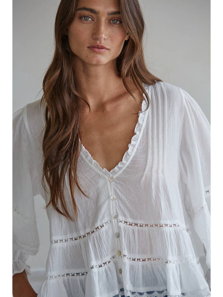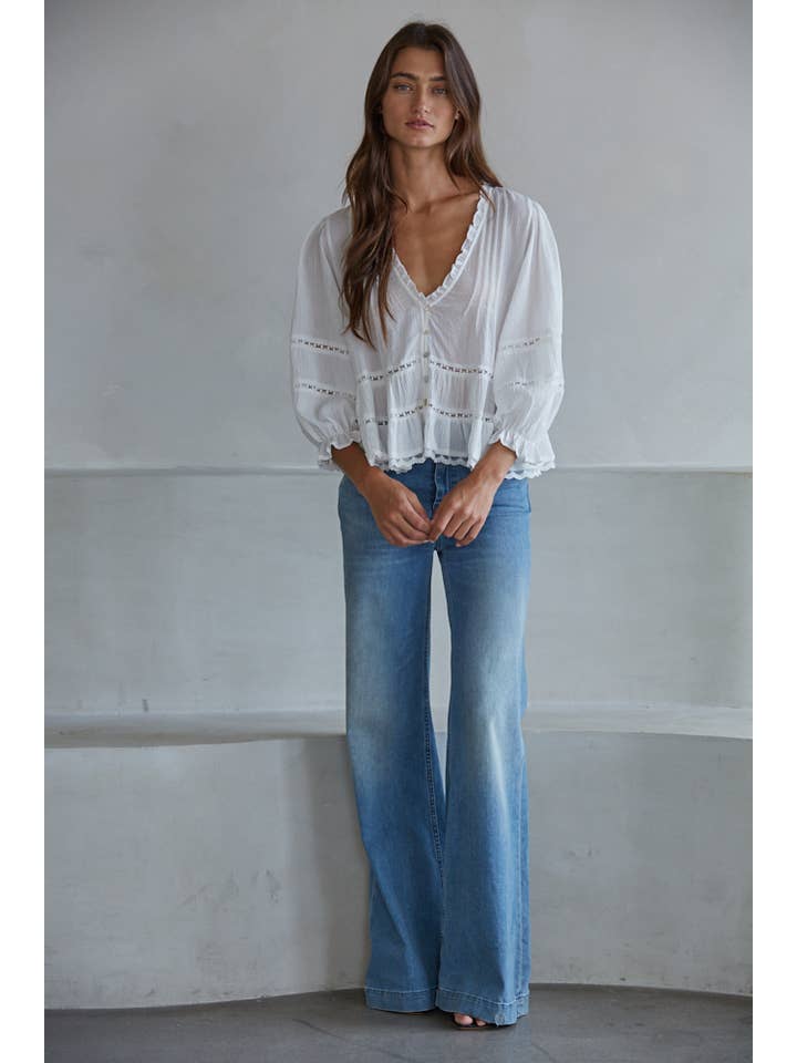 Woven cotton v-neck quarter sleeve top with front buttons and lace trim detail