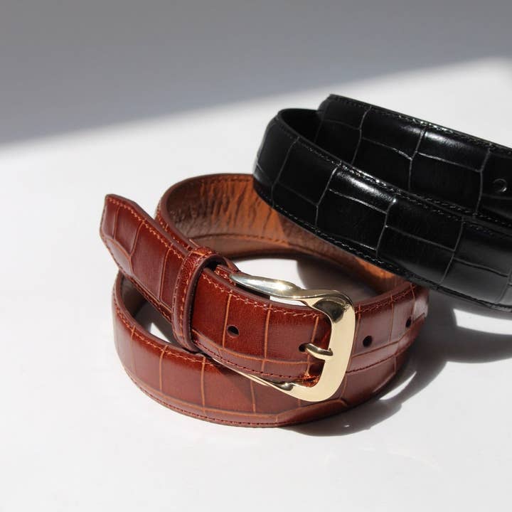 Crafted with inspiration from the archives, the Mildred Belt features a sleek, croc-embossed design and bespoke gold hardware, it's the perfect addition to elevate any outfit. Made from genuine leather, this long-awaited accessory will undoubtedly become a cherished staple for years to come.