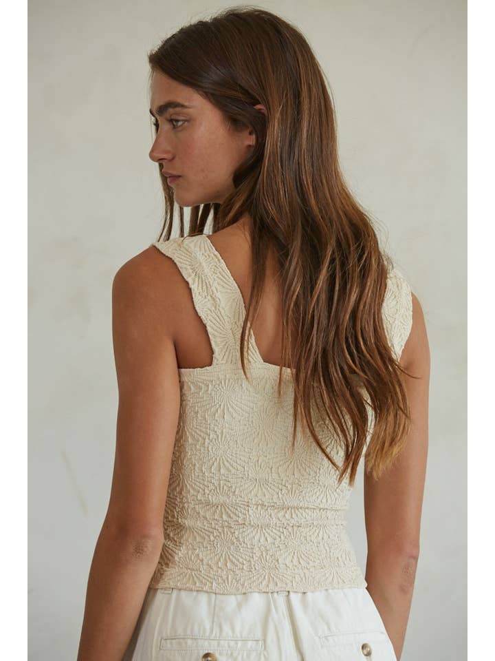 This unique, seamless jacquard tank top is crafted from a blend of Modal, Nylon, and Spandex for a comfortable and stretchy fit. The square neckline, sleeveless design, and all-over floral print create a vintage-inspired look. The ribbed knit construction and cropped length offer a modern and flattering silhouette. Pair it with high-waisted jeans or a skirt for a stylish and feminine outfit.