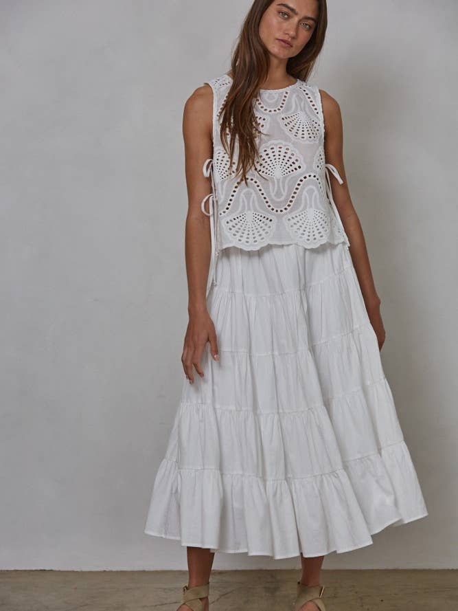 Woven cotton eyelet round neck sleeveless top with open side tie detail