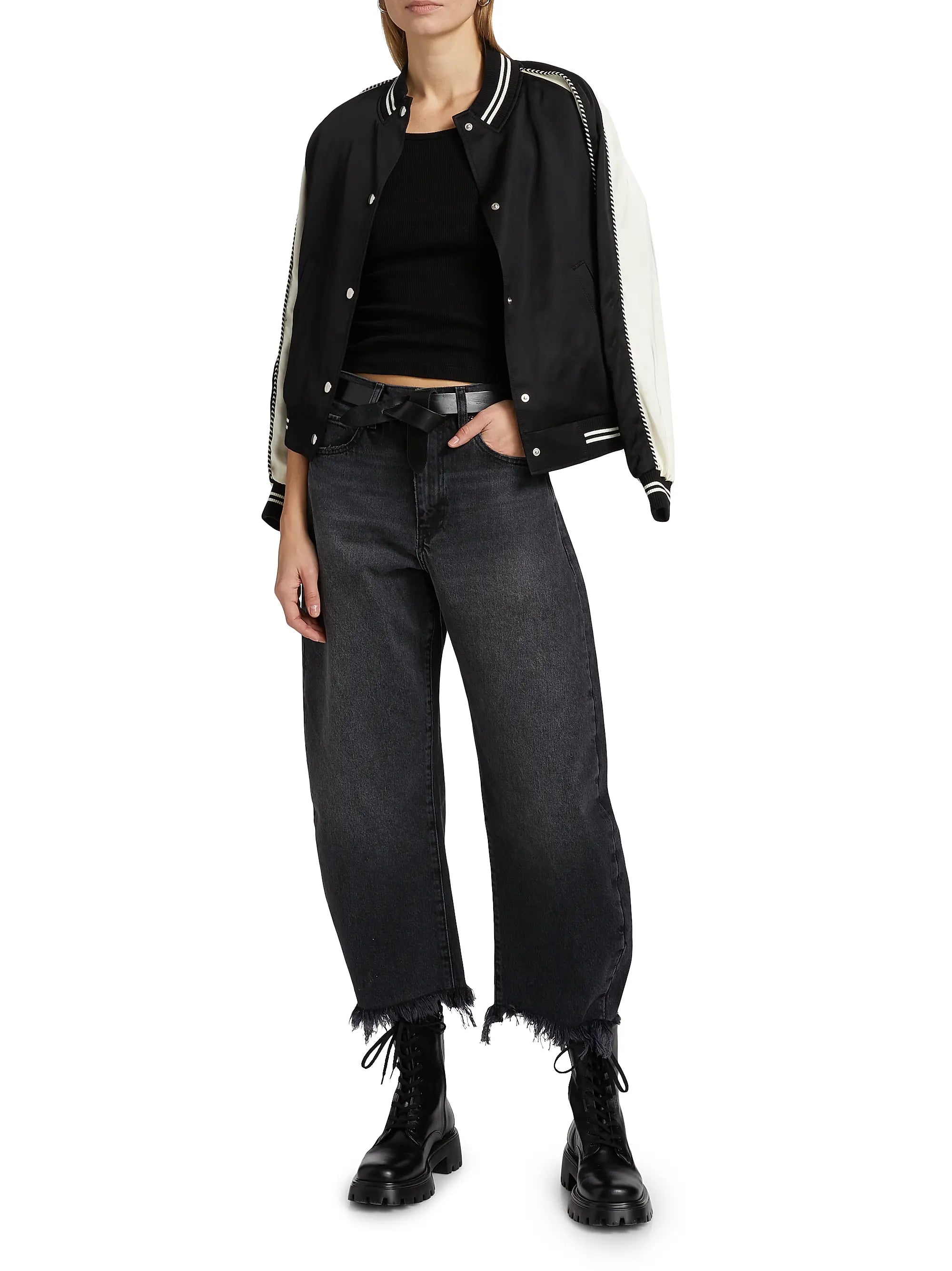 Frame's The Bubble cropped jeans feature raw-edge cuffs, a classic five-pocket style, and barrel-style leg.